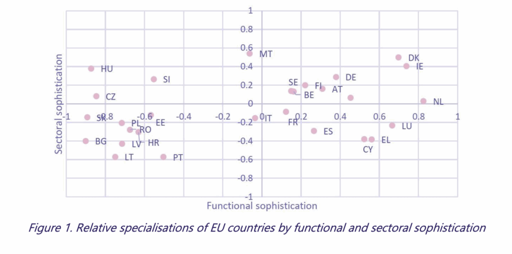 The research on recent trends in EU GVCs undertaken by the team has been summarized in the first report of the project. The findings highlight the regional division of labor within the EU (Figure 1). Northwestern EU countries have a comparative advantage in functions related to pre- and post- production in high-tech sectors, while Southeastern EU countries specialize in production and lower- tech sectors. Indeed, the industrial integration of EU member states in the 2000s went hand in hand with a functional division of tasks along GVCs, such that the old member states remain strongly specialised in high value-added, R&D activities.