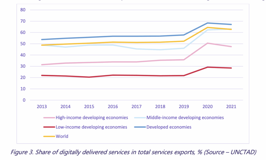 Analysis of the impact of digital capabilities on industrial reshoring indicates that their significance varies depending on the offshoring country. Advanced digital technologies are found to mainly be important in the case of relocations from ‘low-wage’ countries. Analysis of the digitalization of services trade found that it rapidly increased during the pandemic in all regions (Figure 3), but especially in middle income developing countries (which includes India). In the EU, digitalization was found to improve the resilience of exports, a result that was especially strong for some services,( , especially digital services.
